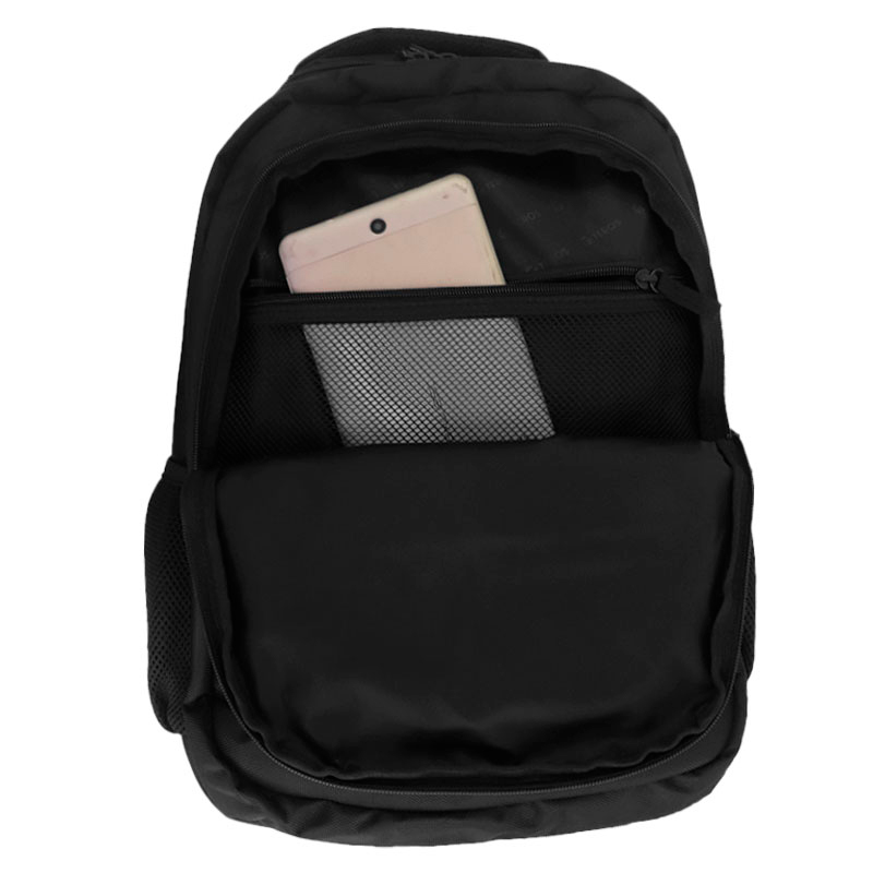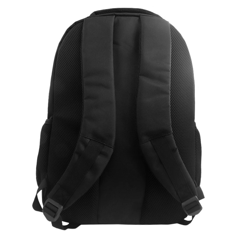 Diseño en color negro con dos ribetes rojos de contraste en forma de «t». Espalda, asa superior y correas traseras acolchadas para mayor comodidad.